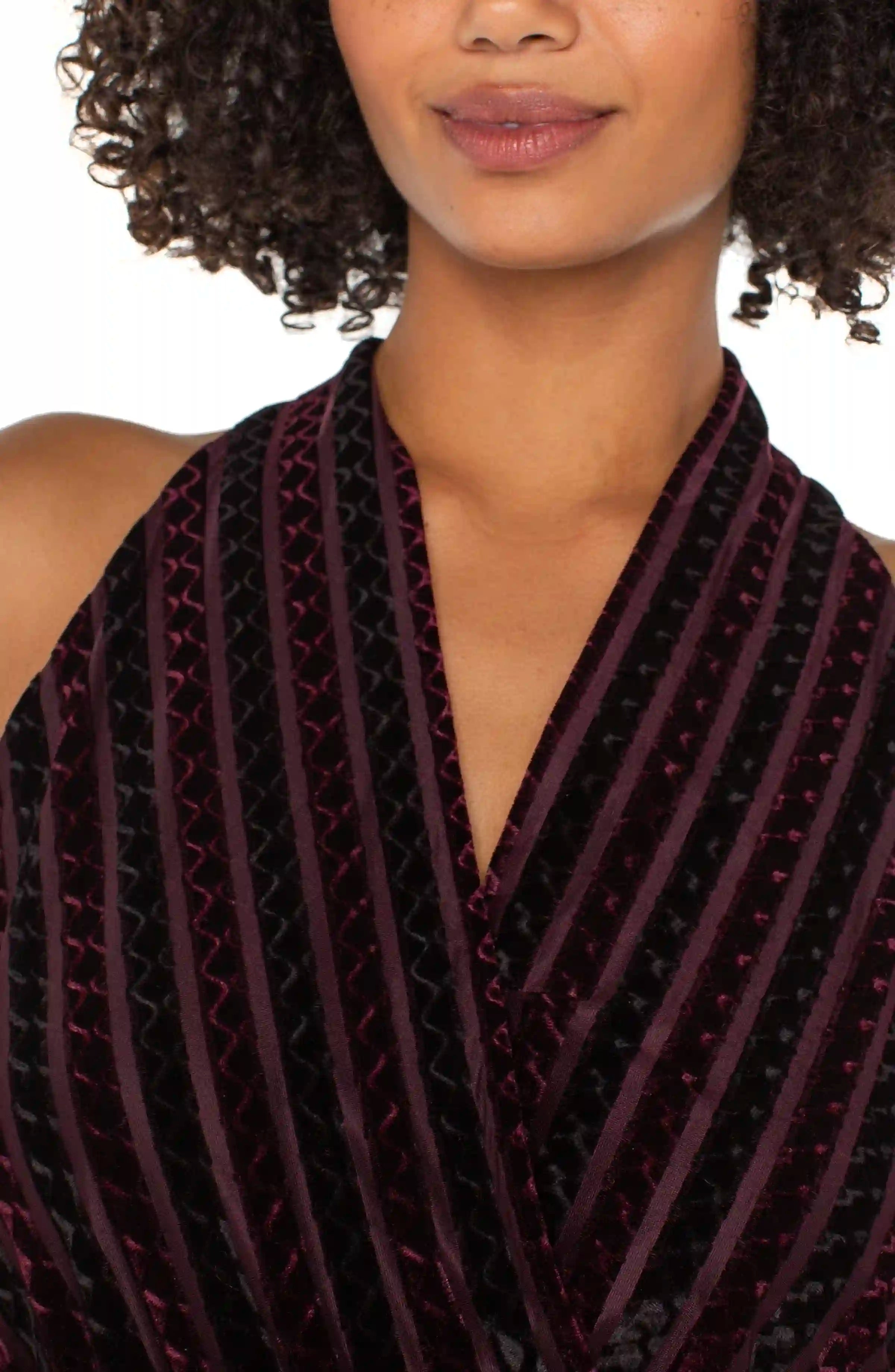 Refined sleeveless essential featuring a softly draped crossover neckline secured with a discreet baby snap closure.